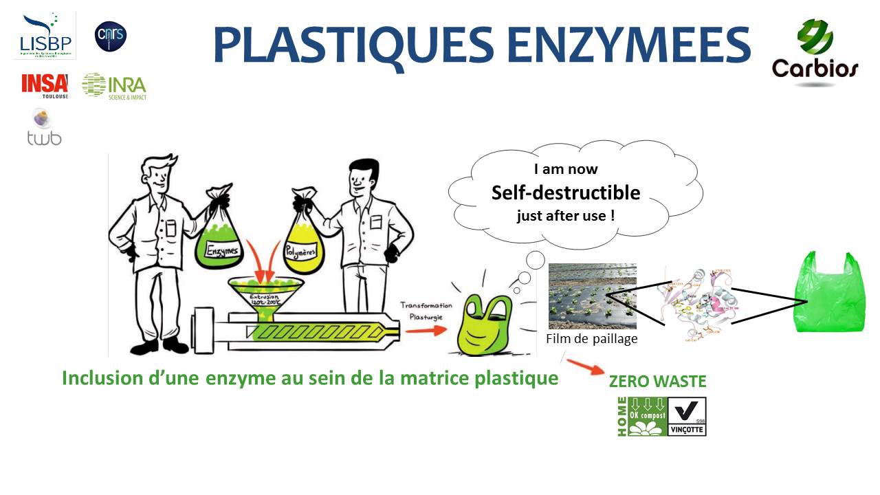Tout d’abord, l’équipe CIMEs (Catalyse et Ingénierie Moléculaire Enzymatiques) du LISBP a identifié et caractérisé une enzyme de dégradation du plastique très efficace. Par ingénierie enzymatique, celle-ci a alors été améliorée de manière à la rendre compatible avec les températures très élevées rencontrées lors du procédé d’extrusion (~170°C). Par la suite, cette enzyme a été produite en fermenteurs de 300L puis formulée au CRITT Bio-industries.