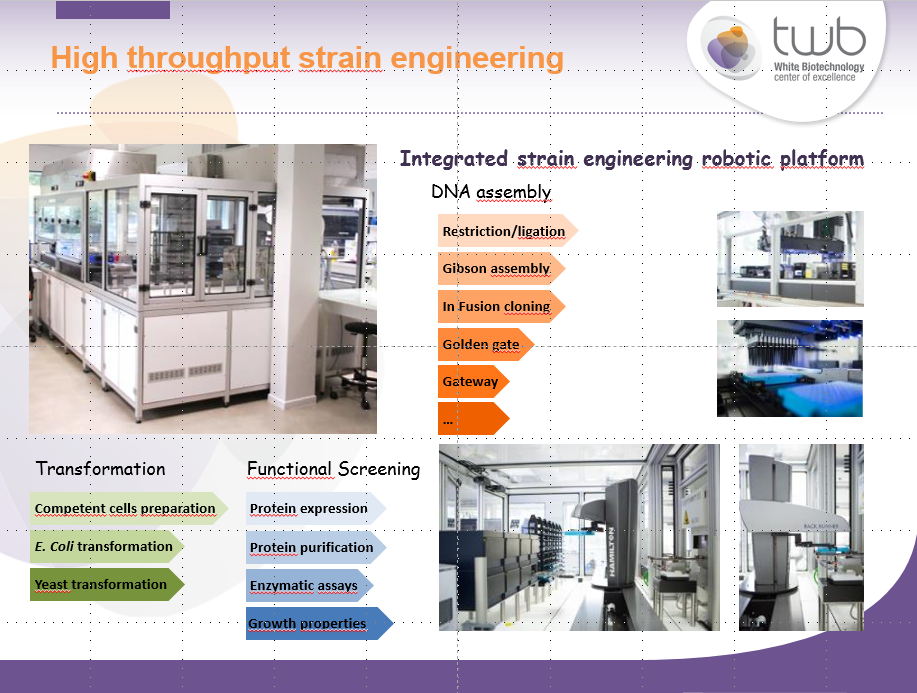 Le plateau haut-débit de TWB a développé un système robotique intégré dédié à l’automatisation des processus d’ingénierie de souches de micro-organismes.