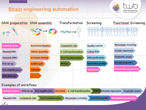 l’ingénierie de souches et la biologie synthétique: plusieurs méthodes d’assemblage d’ADN (clonage), des outils d’édition des génomes par la méthode CRISPR-cas9, la transformation automatisée de plusieurs espèces de micro-organismes (