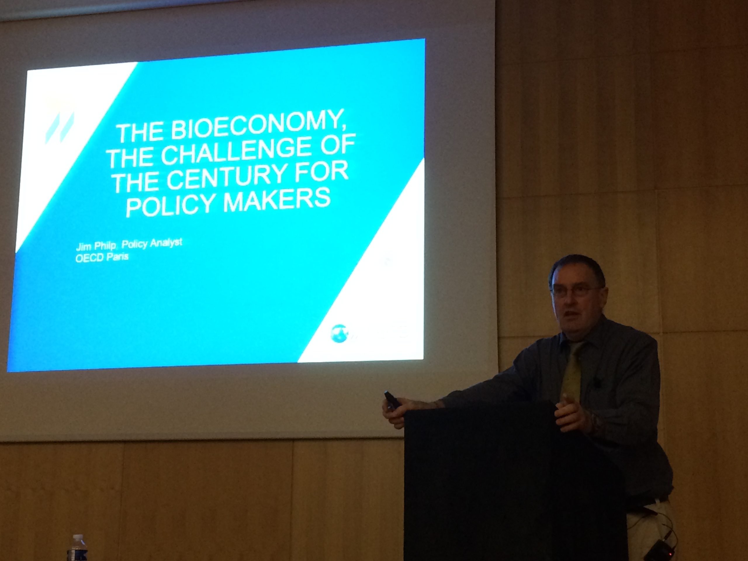 Jim Philp (PhD) a présenté une conférence sur le challenge que représente la bioéconomie face aux nouveaux défis économiques et politiques tels que le changement climatique. J. Philp est Analyste des politiques à l’OCDE depuis 2011, spécialiste du secteur des biotechnologies industrielles.